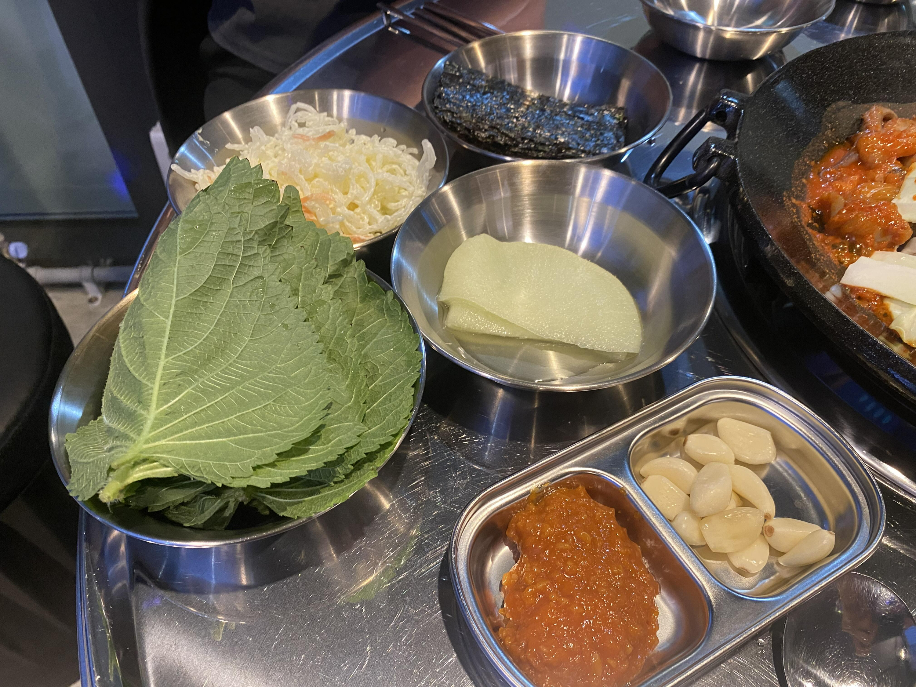 사장님께서는 깻잎 + 김 + 쌈무 + 천사채 조합을 추천하셨습니다.